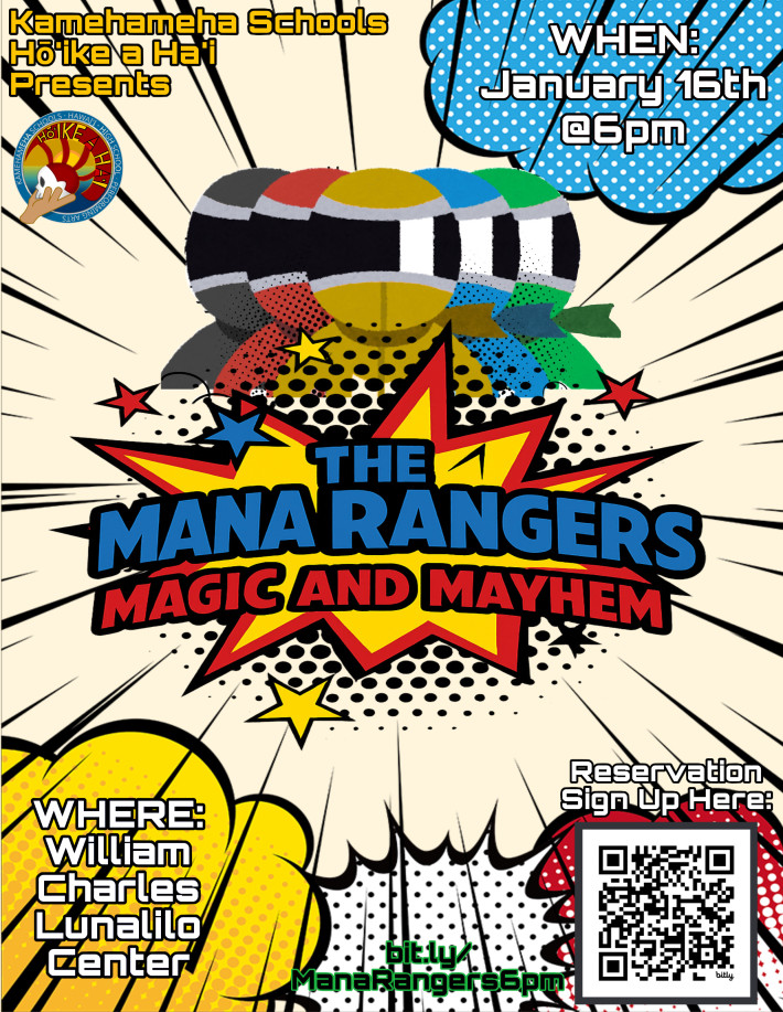 Hōʻike a Haʻi will stage their original children’s theater show, “The Mana Rangers: Magic and Mayhem” on Friday, January 16 at 6pm in the William Charles Lunalilo Center. Admission is free.